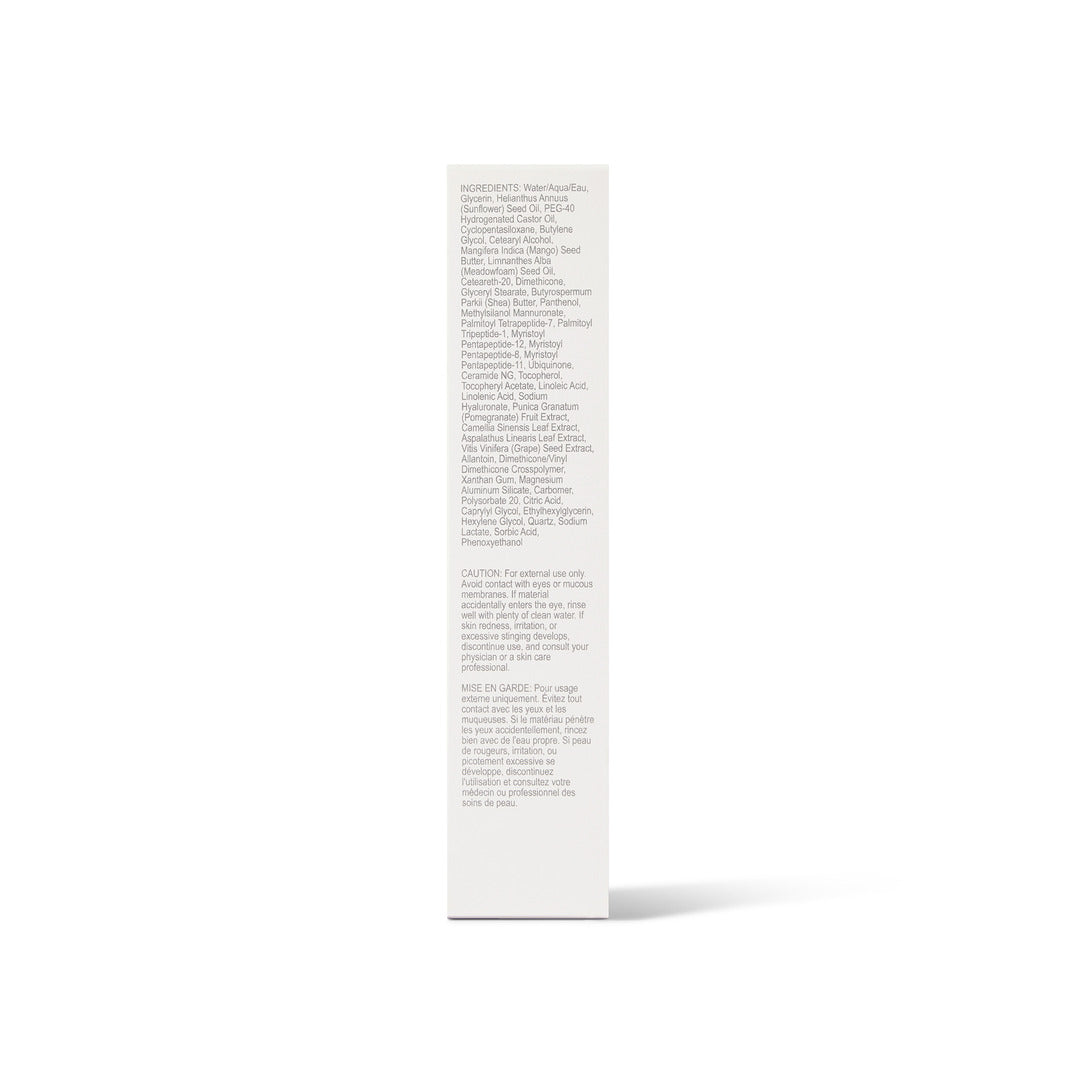 Key Ingredients:Anti-Aging PeptidesCoEnzyme Q10Green Tea ExtractRed Tea ExtractGrape Seed ExtractPomegranate ExtractMeadowfoam Seed OilShea ButterMango Seed ButterIngredients:Water/Aqua/Eau, Glycerin, Helianthus Annuus (Sunflower) Seed Oil, PEG-40 Hydrogenated Castor Oil, Cyclopentasiloxane, Butylene Glycol, Cetearyl Alcohol, Mangifera Indica (Mango) Seed Butter, Limnanthes Alba (Meadowfoam) Seed Oil, Ceteareth-20, Dimethicone, Glyceryl Stearate, Butyrospermum Parkii (Shea) Butter, Panthenol, Methylsilanol Mannuronate, Palmitoyl Tetrapeptide-7, Palmitoyl Tripeptide-1, Myristoyl Pentapeptide-12, Myristoyl Pentapeptide-8, Myristoyl Pentapeptide-11, Ubiquinone, Ceramide NG, Tocopherol, Tocopheryl Acetate, Linoleic Acid, Linolenic Acid, Sodium Hyaluronate, Punica Granatum (Pomegranate) Fruit Extract, Camellia Sinensis Leaf Extract, Aspalathus Linearis Leaf Extract, Vitis Vinifera (Grape) Seed Extract, Allantoin, Dimethicone/Vinyl Dimethicone Crosspolymer, Xanthan Gum, Magnesium Aluminum Silicate, Carbomer, Polysorbate 20, Citric Acid, Caprylyl Glycol, Ethylhexylglycerin, Hexylene Glycol, Quartz, Sodium Lactate, Sorbic Acid, Phenoxyethanol